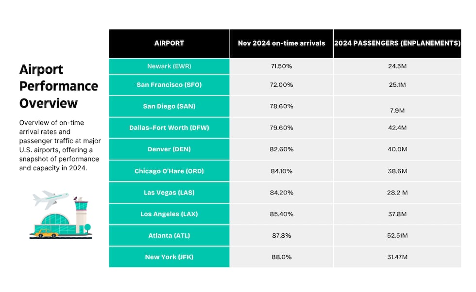 - On-time arrival rates for November 2024 from the U.S. Department of Transportation’s Air Travel Consumer Report (January 2025 edition).